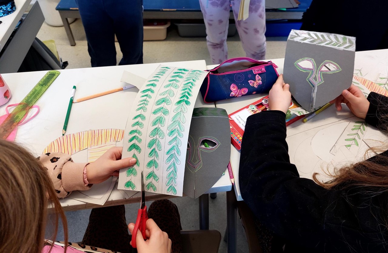 Εμπνευστήκαμε από τα αγγεία της γεωμετρικής περιόδου για να σχεδιάσουμε περικεφαλαίες. Τις χρωματίσαμε, τις κολλήσαμε και με μεγάλη χαρά τις φορέσαμε δημιουργώντας προσωπεία-μάσκες συνδυάζοντας στοιχεία από το μάθημα της Ιστορίας με μια νότα Αποκριών.