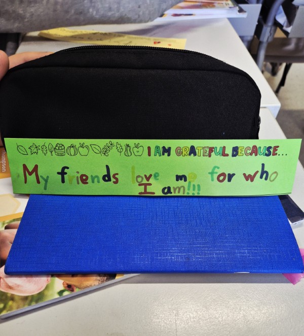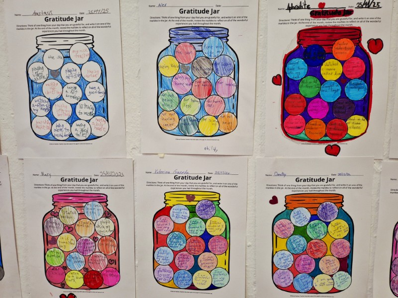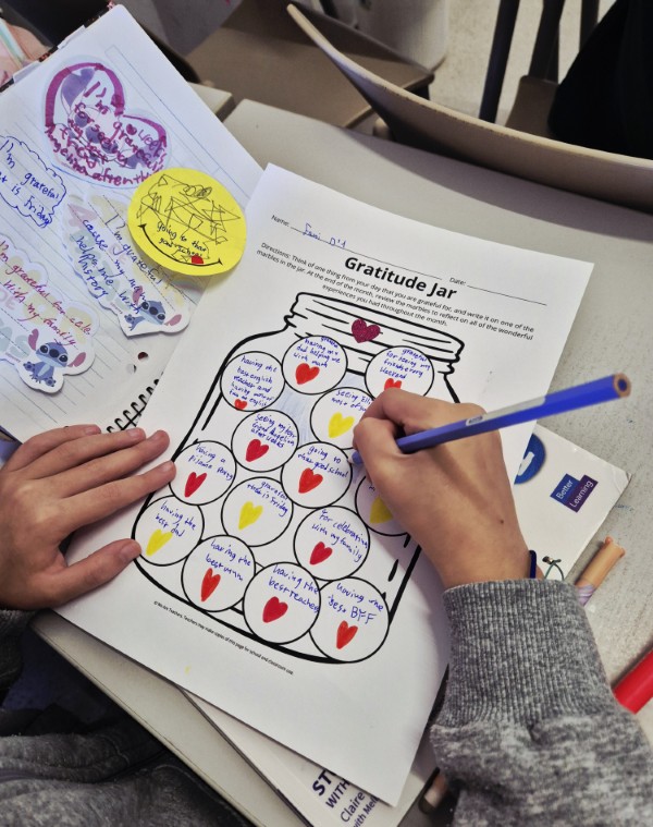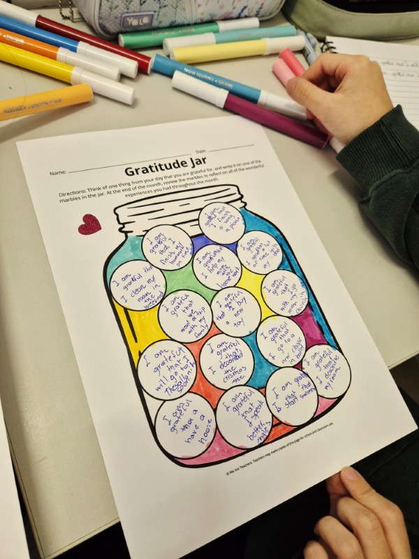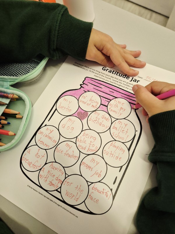 Αντίστοιχα, οι μαθητές/τριες της δ’ Δημοτικού του τμήματος στο οποίο διδάσκει η Β. Κατωπόδη κατέγραφαν καθημερινά καθ’ όλη τη διάρκεια του Νοεμβρίου στο τέλος της ημέρας έναν λόγο για τον οποίο ένιωσαν ευγνωμοσύνη. Στο τέλος του μήνα γέμισαν τη «γυάλα της ευγνωμοσύνης»–«Gratitude Jar» με βόλους όπου αναγράφονταν όλοι οι λόγοι που είχαν συλλέξει. Τέλος, ζωγράφισαν και έγραψαν πάνω στα κυκλάκια της γυάλας ποιοι αισθάνονται ότι είναι οι πιο σημαντικοί παράγοντες ευγνωμοσύνης.
