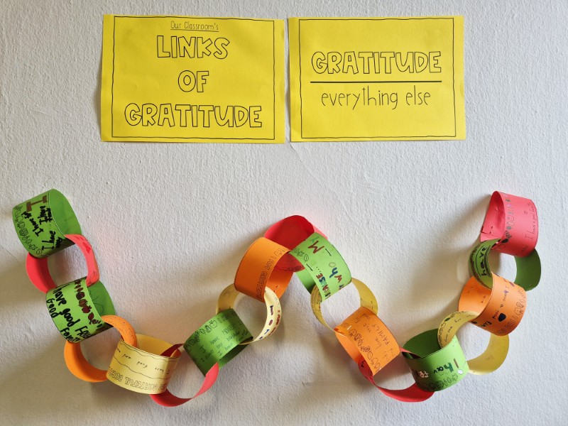 Με αφορμή την Ημέρα των Ευχαριστιών, τα παιδιά της γ’ Δημοτικού, μαζί με τη δασκάλα τους κ. Β. Κατωπόδη, έμαθαν για την ιστορία της ημέρας αυτής και ανακάλυψαν την αξία της ευγνωμοσύνης. Δημιουργήσαν «την αλυσίδα της ευγνωμοσύνης της τάξης» τους–«Our Classroom’s Links of Gratitude» (μιας και η ευγνωμοσύνη είναι μια από τις πιο χαρακτηριστικές αξίες της ημέρας των ευχαριστιών) με πράγματα για οποία νιώθουν ευγνώμων. Πάνω στους κρίκους της, ζωγράφισαν και έγραψαν τα πιο σημαντικά πράγματα για τα οποία θέλουν να πουν «Ευχαριστώ»!