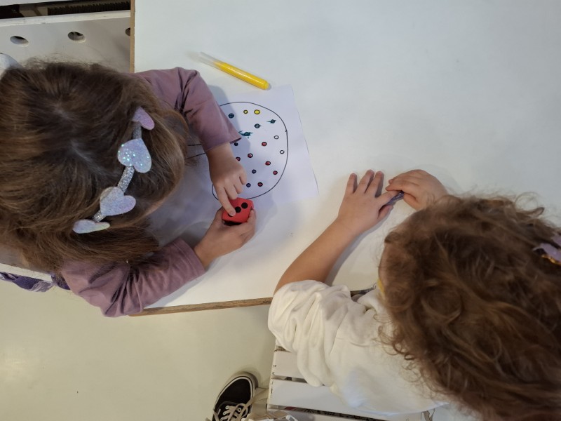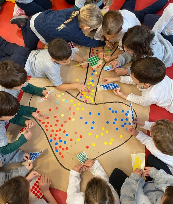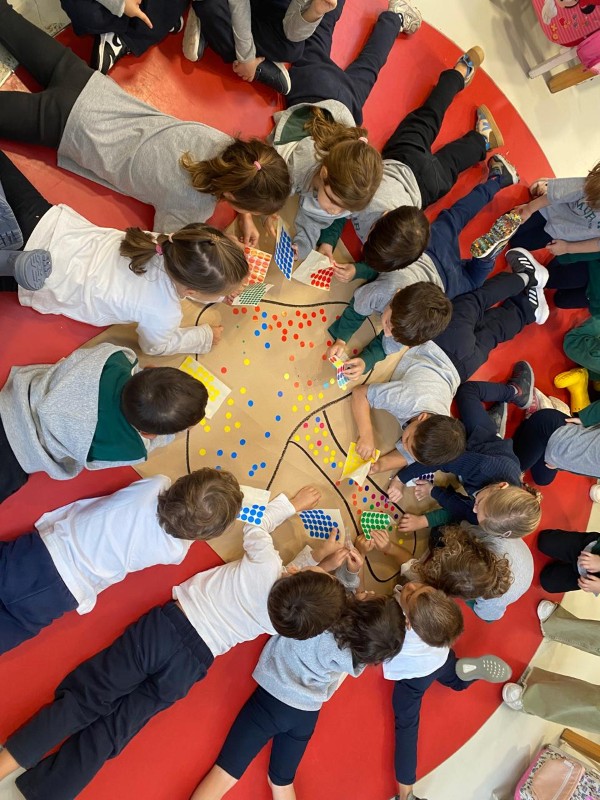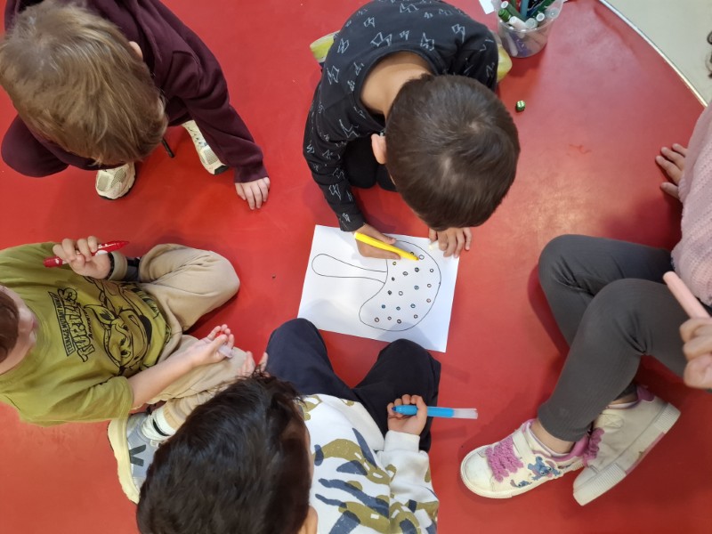 Ο Οκτώβριος βρήκε τα παιδιά της Γαλάζιας Τάξης να αναζητούν τις ενδείξεις του Φθινοπώρου στο σχολείο. Ο πιο ενδιαφέρων θησαυρός που ανακάλυψαν ήταν τα μανιτάρια. Αφού παρατήρησαν τα διάφορα είδη μανιταριών και τα μοίρασαν στις ομάδες της τάξης, τα παιδιά κλήθηκαν να βρουν ένα όνομα για το μανιτάρι που τους έτυχε και να το παρουσιάσουν στους συμμαθητές/ήτριές τους. Με αφορμή την θεματική των μανιταριών, μίλησαν για την Γιαγιόι Κουσάμα, την γιαπωνέζα καλλιτέχνη που αυτό που χαρακτηρίζει το έργο της είναι οι βούλες. Βασισμένα στο βιβλίο «Από εδώ μέχρι το άπειρο» των εκδόσεων Μέλισσα και στο ίδιο το της έργο τα παιδιά έφτιαξαν ένα ομαδικό έργο χρησιμοποιώντας στρογγυλά αυτοκόλλητα. Στη συνέχεια, το κάθε παιδί δημιούργησε το δικό του μανιτάρι. Στην ενότητα των μαθηματικών εννοιών, τα παιδιά μέσα από ένα επιτραπέζιο παιχνίδι κλήθηκαν να δουλέψουν την αντιστοιχία ποσότητας, αλλά και την σύγκριση μεγεθών. Χρησιμοποιώντας ένα ζάρι τα παιδιά έπρεπε να γεμίσουν τόσες βούλες στο μανιτάρι όσες και η ζαριά τους. Στο τέλος του παιχνιδιού έπρεπε να καταλήξουν ποιο παιδί κατάφερε να χρωματίσει τις περισσότερες βούλες και άρα ήταν ο νικητής.