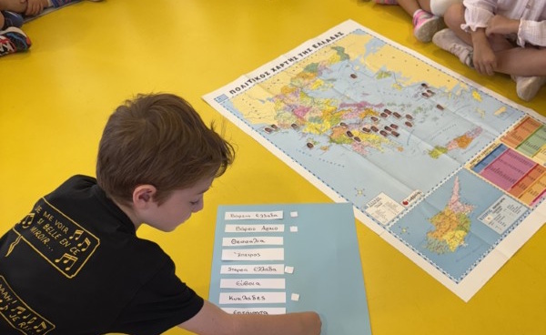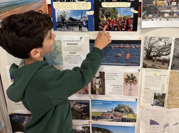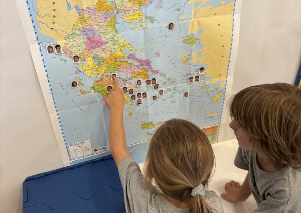 Με αφορμή τις φωτογραφίες από τις καλοκαιρινές τους διακοπές, τα παιδιά της Κόκκινης Τάξης μοιράστηκαν με τους συμμαθητές και τις συμμαθήτριές του αναμνήσεις, ταξίδια και αγαπημένες στιγμές. Εντόπισαν στον χάρτη της Ελλάδας τα μέρη που επισκέφτηκαν και πάνω του τοποθέτησαν τις φωτογραφίες τους. Κάπως έτσι έγιναν μικροί ερευνητές και άρχισαν να βγάζουν συμπεράσματα: Πόσοι πήγαν σε παραθαλάσσια μέρη; Πόσοι στη βόρεια και πόσοι στη νότια Ελλάδα; Ποιο μέρος προτίμησαν τα περισσότερα παιδιά; Μέσα από αυτές τις δράσεις γνώρισαν τους διαφορετικούς τύπους οικισμών της χώρας μας. Ξεχώρισαν πέντε περιοχές -τη Μάνη, το Πήλιο, τα Ζαγοροχώρια, τις Κυκλάδες και τα Επτάνησα. Κάθε παιδί έφερε πληροφορίες, εικόνες και ιδέες για την περιοχή που του άρεσε περισσότερο. Το ταμπλό της τάξης γέμισε με φωτογραφίες, ζωγραφιές, κολλάζ και όμορφες δημιουργίες! Στο τέλος, κάθε παιδί διάλεξε ένα στοιχείο που του έκανε εντύπωση και το αποτύπωσε στο χαρτί με τον δικό του μοναδικό τρόπο.