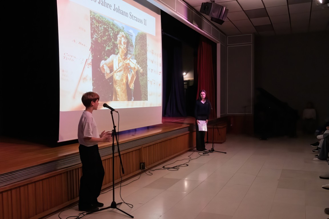 Οι μαθητές της Α’ Γυμνασίου παρουσίασαν πληροφορίες και ενδιαφέρουσες λεπτομέρειες από τη ζωή και το έργο του “βασιλιά του βαλς”, ενώ οι μαθητές της Ε’ Δημοτικού πλαισίωσαν την εκδήλωση με έναν όμορφο χορό, δίνοντας ζωντάνια και κίνηση στη μουσική του συνθέτη.