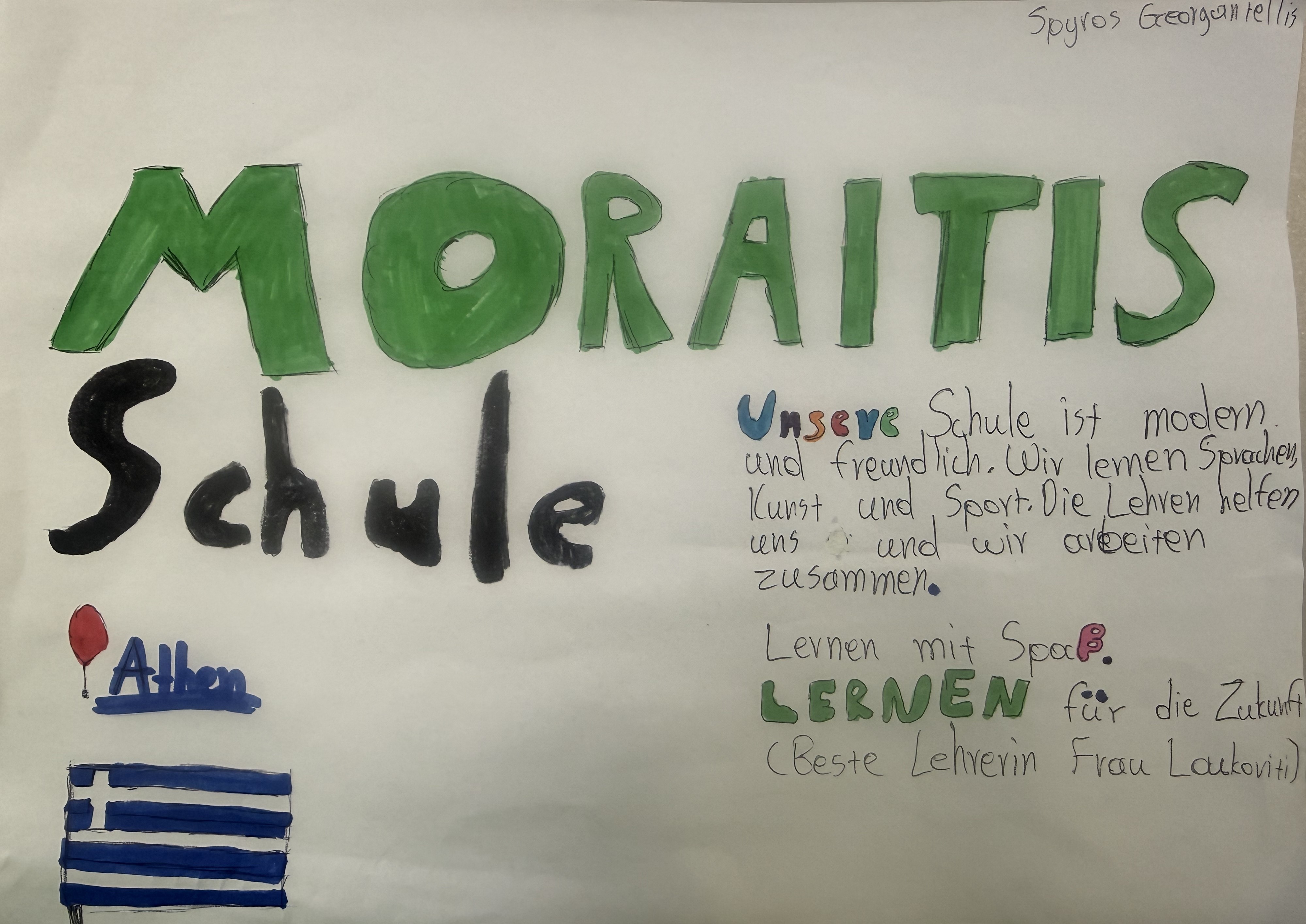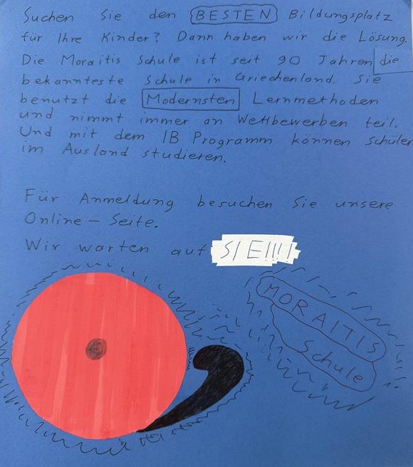 Στο μάθημα των Γερμανικών, οι μαθητές και οι μαθήτριες του προχωρημένου της α΄ Γυμνασίου συμμετείχαμε σε μια δημιουργική και βιωματική δραστηριότητα, κατά την οποία δημιουργήσαμε διαφημιστικά σλόγκαν για το σχολείο μας. Η εργασία αυτή μας έδωσε την ευκαιρία να εφαρμόσουμε το λεξιλόγιο και τις γραμματική που έχουμε διδαχθεί, να καλλιεργήσουμε τη δημιουργική μας σκέψη και να συνεργαστούμε αποτελεσματικά. Μέσα από τη διαδικασία αυτή, ενισχύθηκε το ενδιαφέρον μας για τη γερμανική γλώσσα, ενώ παράλληλα αναδείχθηκαν οι αξίες του σχολείου μας, όπως η συνεργασία, ο σεβασμός και η αγάπη για τη μάθηση.