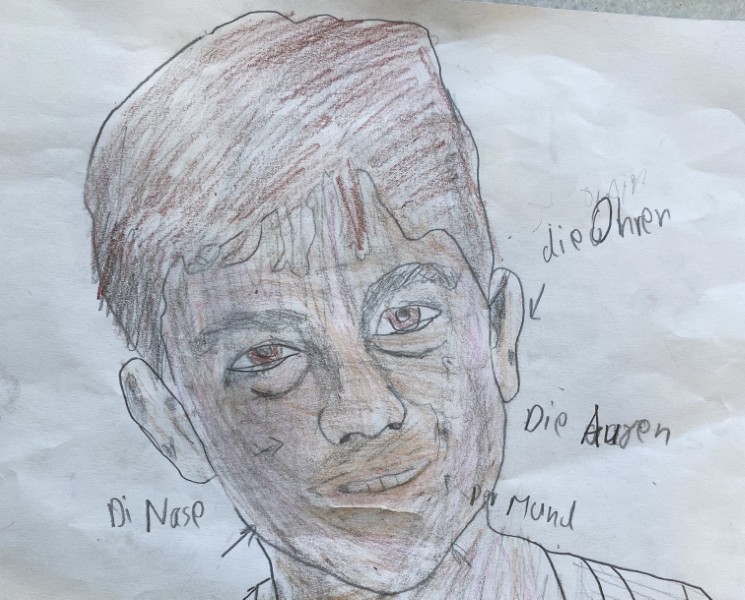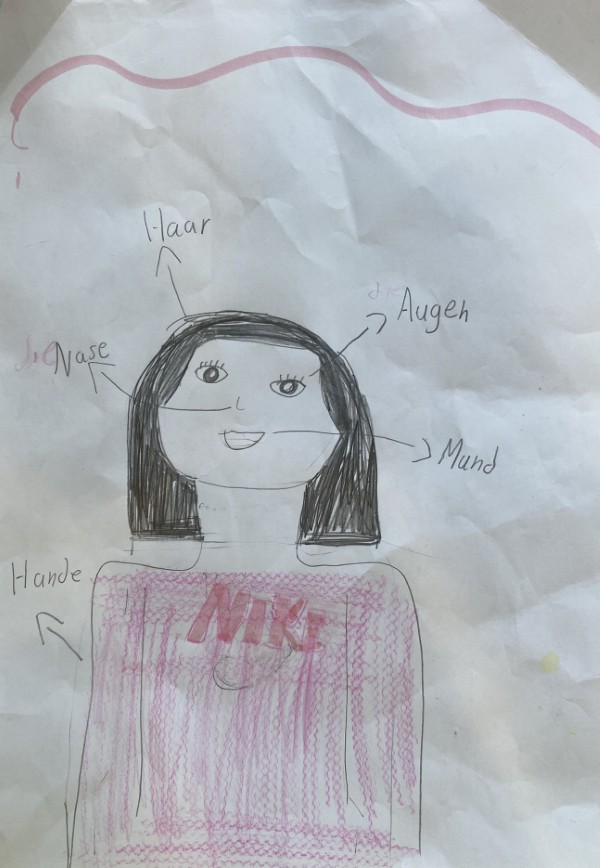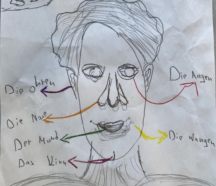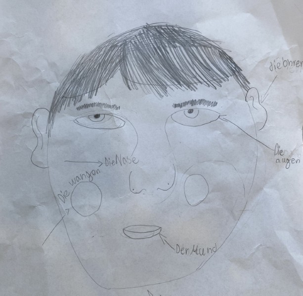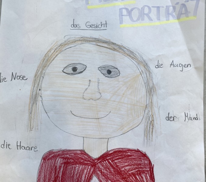 Στα Γερμανικά ζωγραφίσαμε το πορτρέτο μας, αλλά μόνο το πρόσωπο. Ζωγραφίσαμε τα μάτια, τη μύτη, το στόμα, τα αυτιά και τα μαλλιά μας, προσπαθώντας να μοιάζουν όσο γίνεται με τα δικά μας. Κάποιοι έδωσαν έμφαση στο χαμόγελο, άλλοι στα μάτια ή στα ιδιαίτερα χαρακτηριστικά τους. Στη συνέχεια, παρουσιάσαμε το έργο μας στην τάξη στα Γερμανικά, ονομάζοντας τα μέρη του προσώπου και περιγράφοντας την εμφάνισή μας. Η δραστηριότητα αυτή μας βοήθησε να μάθουμε και να χρησιμοποιήσουμε σωστά το σχετικό λεξιλόγιο με έναν δημιουργικό και ευχάριστο τρόπο.