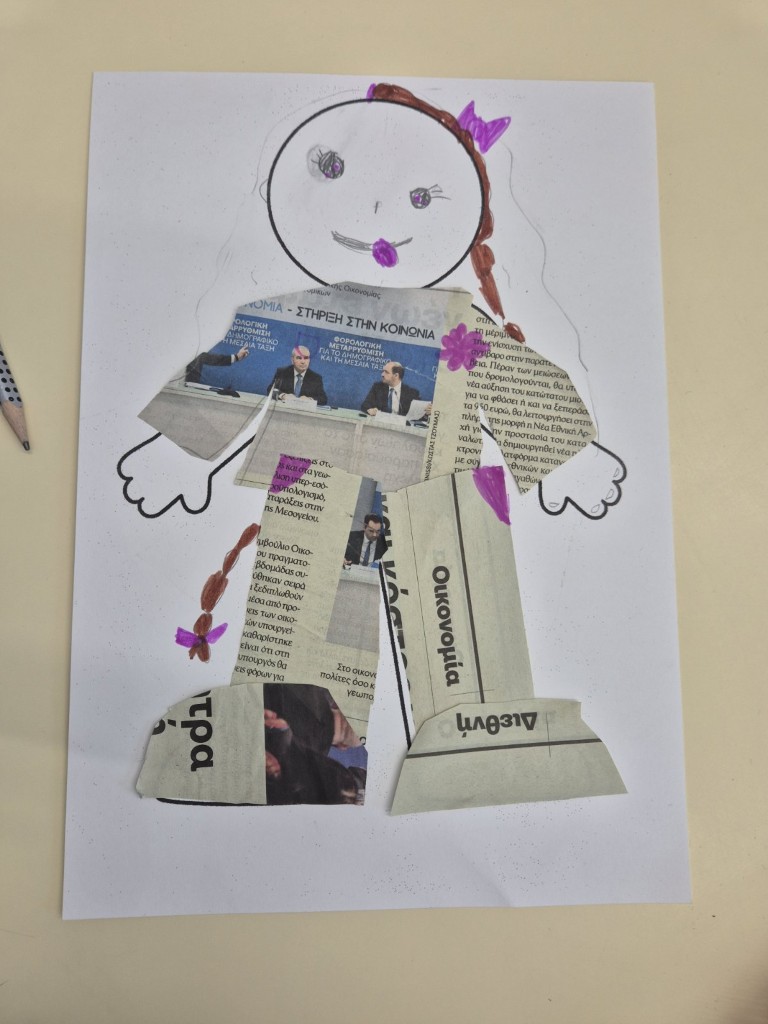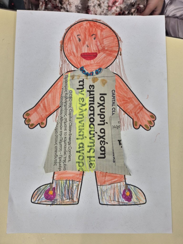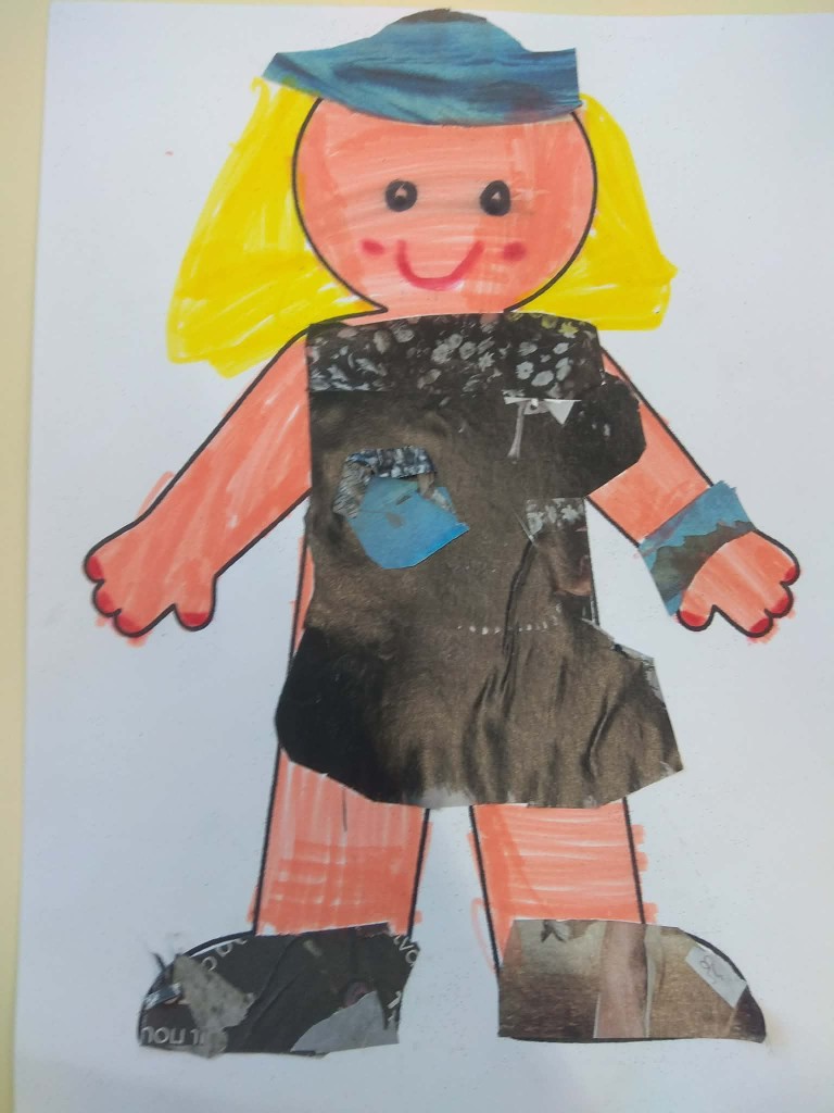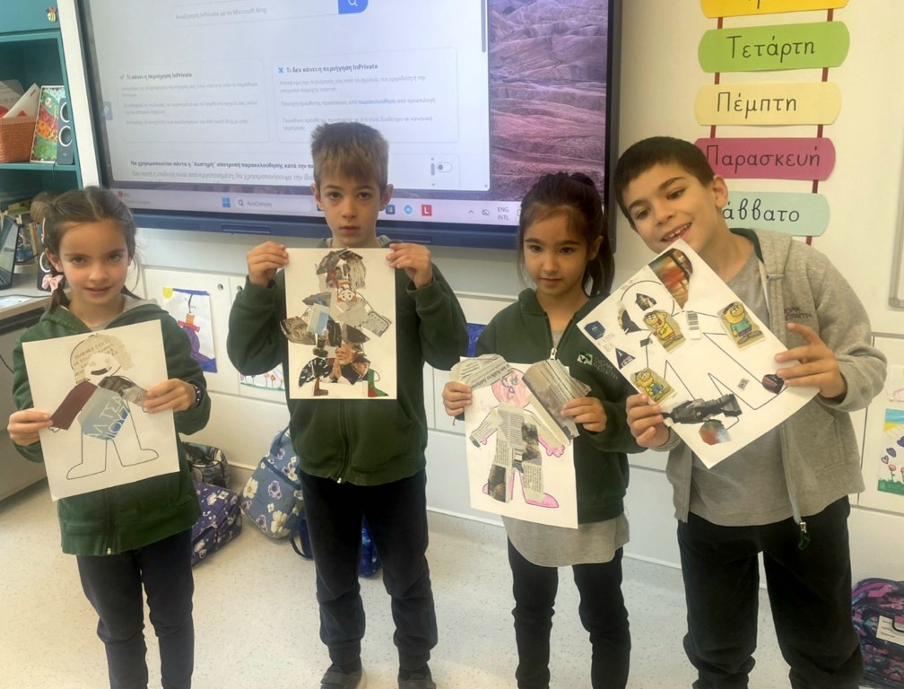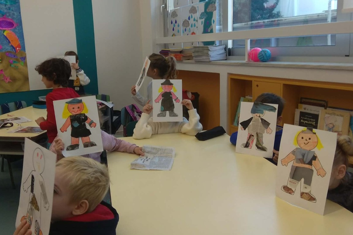 Στο μάθημα των Αγγλικών της Α΄Δημοτικού εμπνευστήκαμε από την ενότητα του βιβλίου μας που μιλάει για τα ρούχα και συζητήσαμε πολύ γύρω από το θέμα αυτό. Επικεντρωθήκαμε στα ρούχα που φοράμε στην καθημερινότητά μας, κατά τη διάρκεια της χειμερινής αλλά και της θερινής περιόδου. Έχοντας ως στόχο τη βιωματική μάθηση και την καλλιέργεια της φαντασίας σε συνδυασμό με την ανάκληση και τη χρήση ήδη γνωστού λεξιλογίου, συγκεντρώσαμε φωτογραφικό υλικό από περιοδικά και εφημερίδες και δημιουργήσαμε σε κολάζ τα δικά μας μοντέλα.